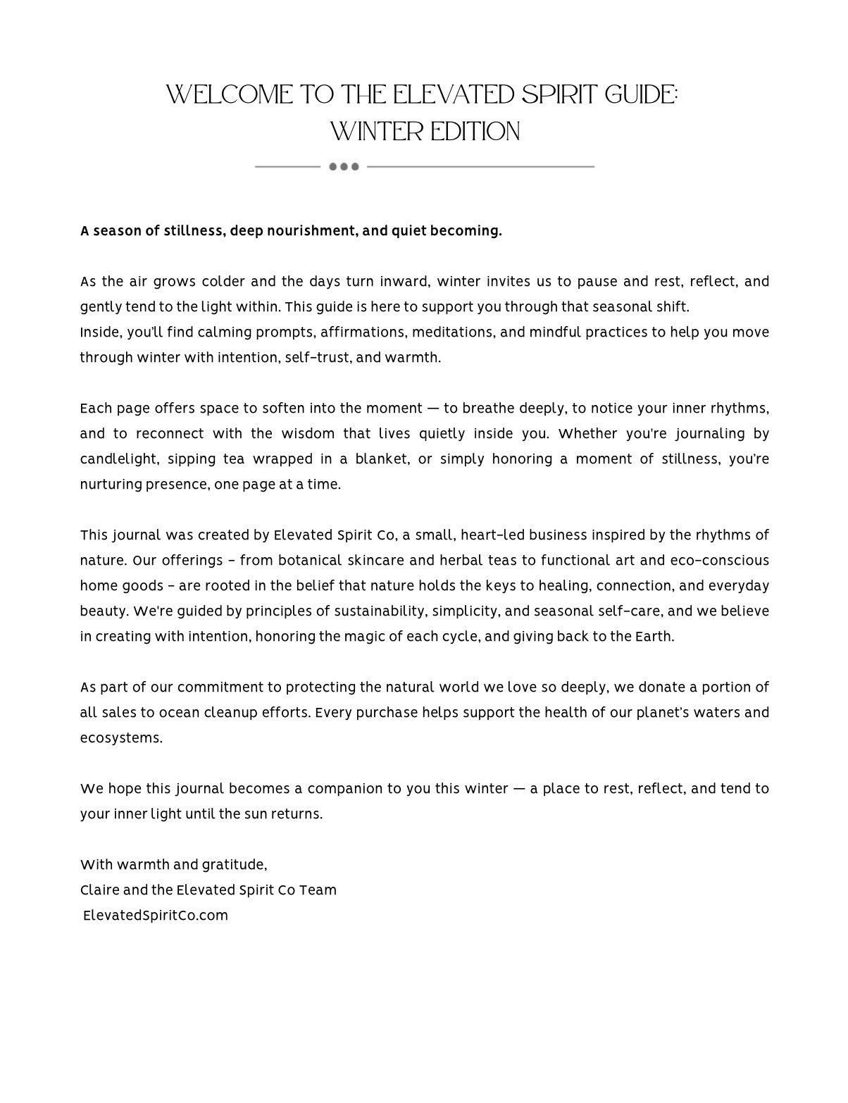 The Elevated Spirit Guide: Winter Edition is your gentle companion through this inward journey — a nurturing space to pause, reconnect, and grow in harmony with the rhythms of winter.